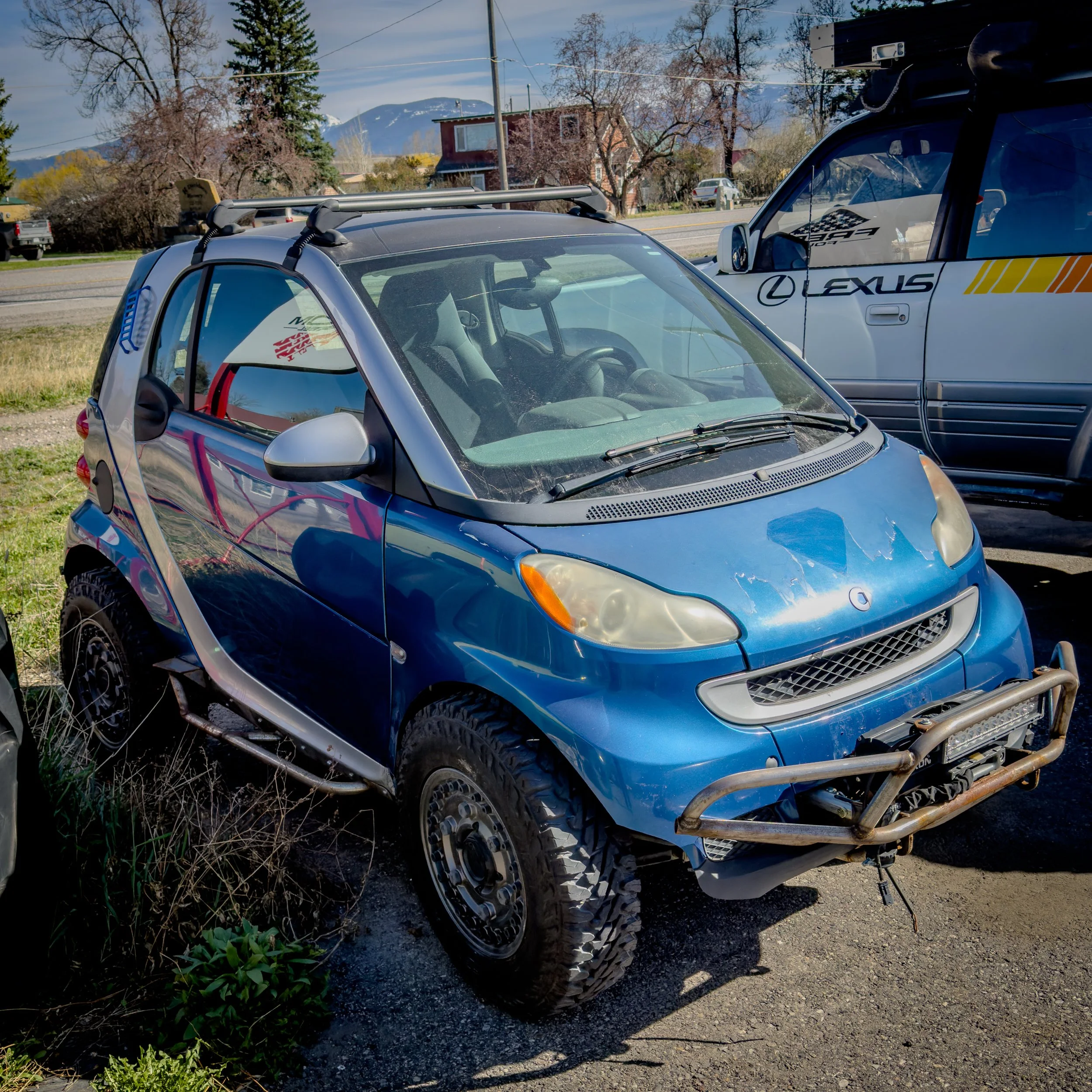 But honestly, I love the ambition. You’ve got this tiny blueberry-looking car sitting next to a lifted Lexus Land Cruiser like,
